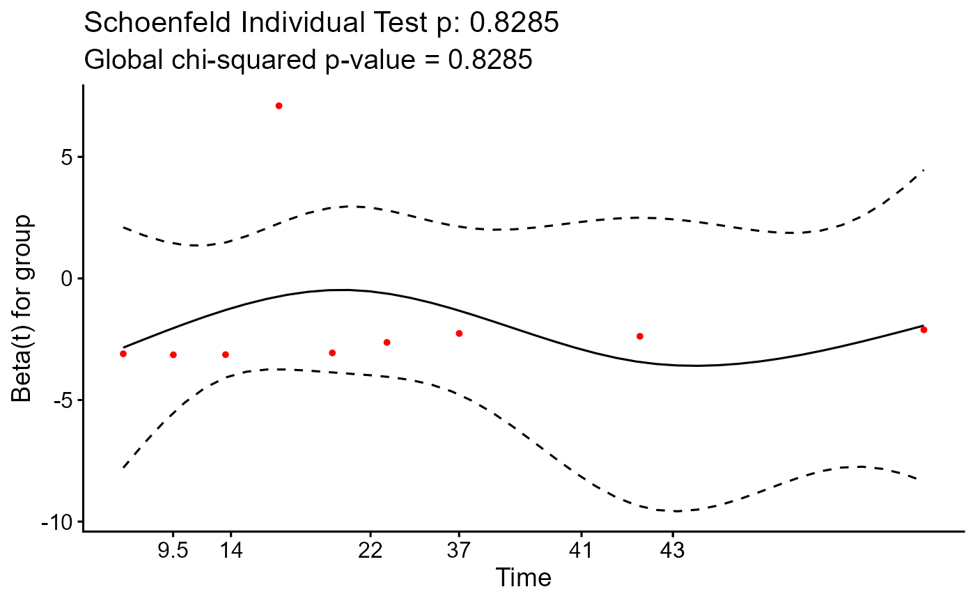 Plots Schoenfeld residuals to check the proportional hazards (PH) assumption for the final Cox model. Satisfies SRR **G3.1a**.