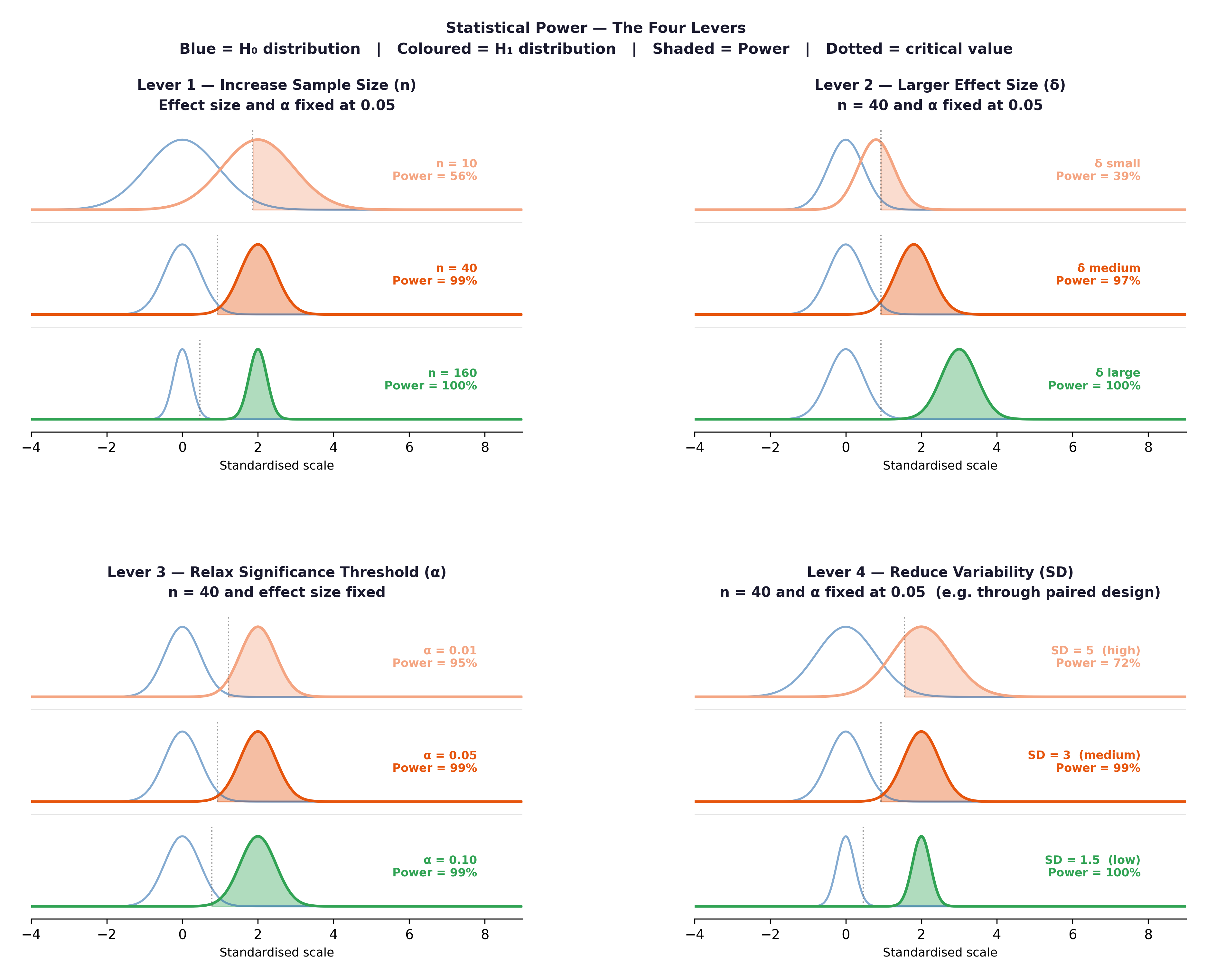 Fig. 13 Figure 5.4 The four levers of statistical power. Increasing any of these raises power and reduces Type II error risk.#