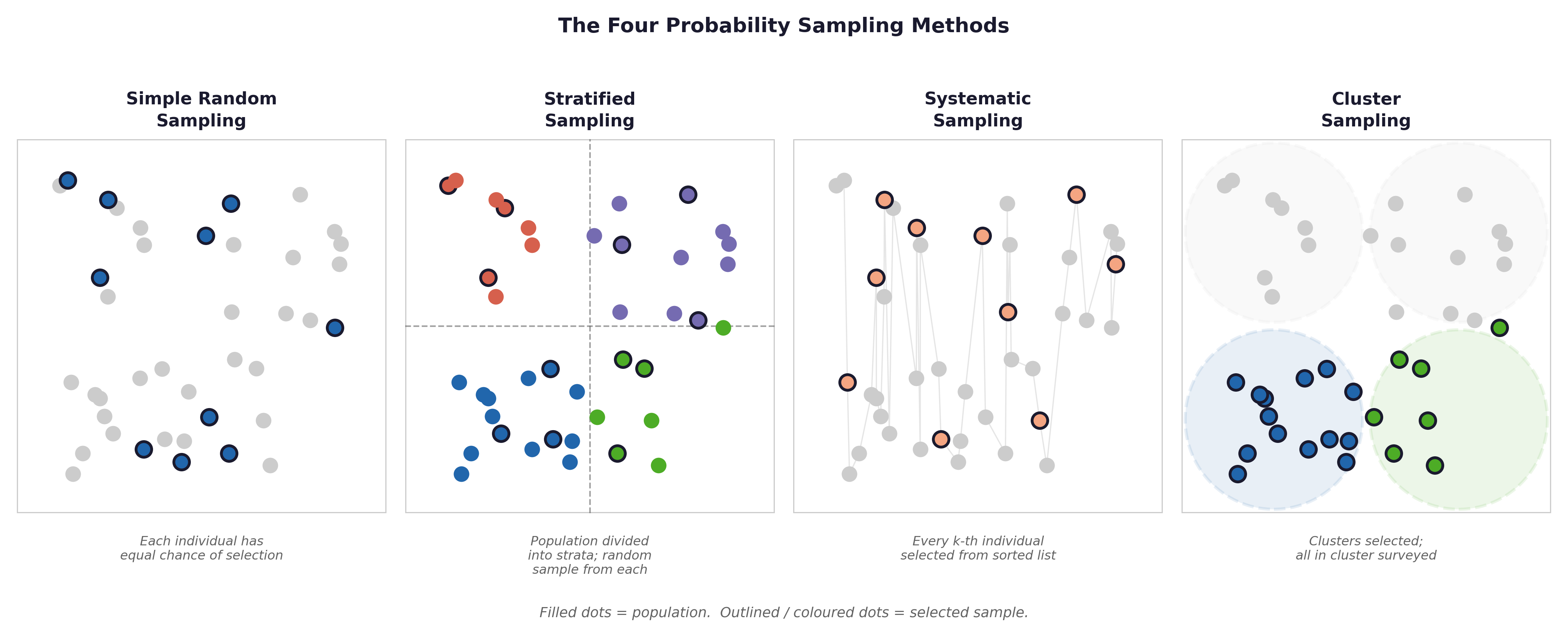 Fig. 10 Figure 5.1 Four probability sampling methods (simple random, stratified, systematic, cluster) and three non-probability methods (convenience, purposive, snowball). The Framingham study used a near-census approach — close to simple random sampling within eligible age bands. This is why its findings generalise well to similar populations.#