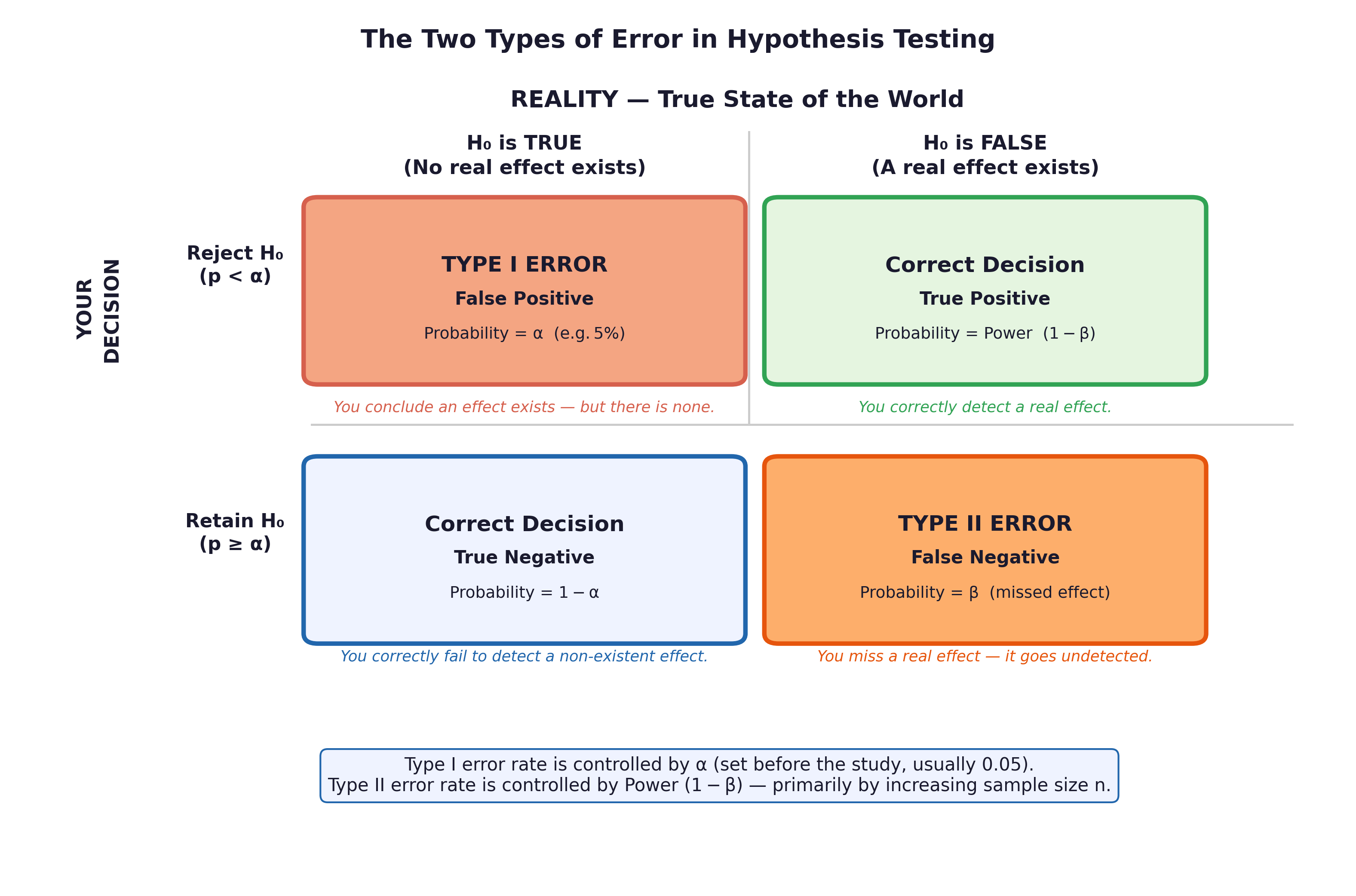 💡 Plain English first: Think of hypothesis testing like a court trial. H₀ (“innocent until proven guilty”) is assumed true until the data provides sufficient evidence to reject it. H₁ is the prosecution’s case.
