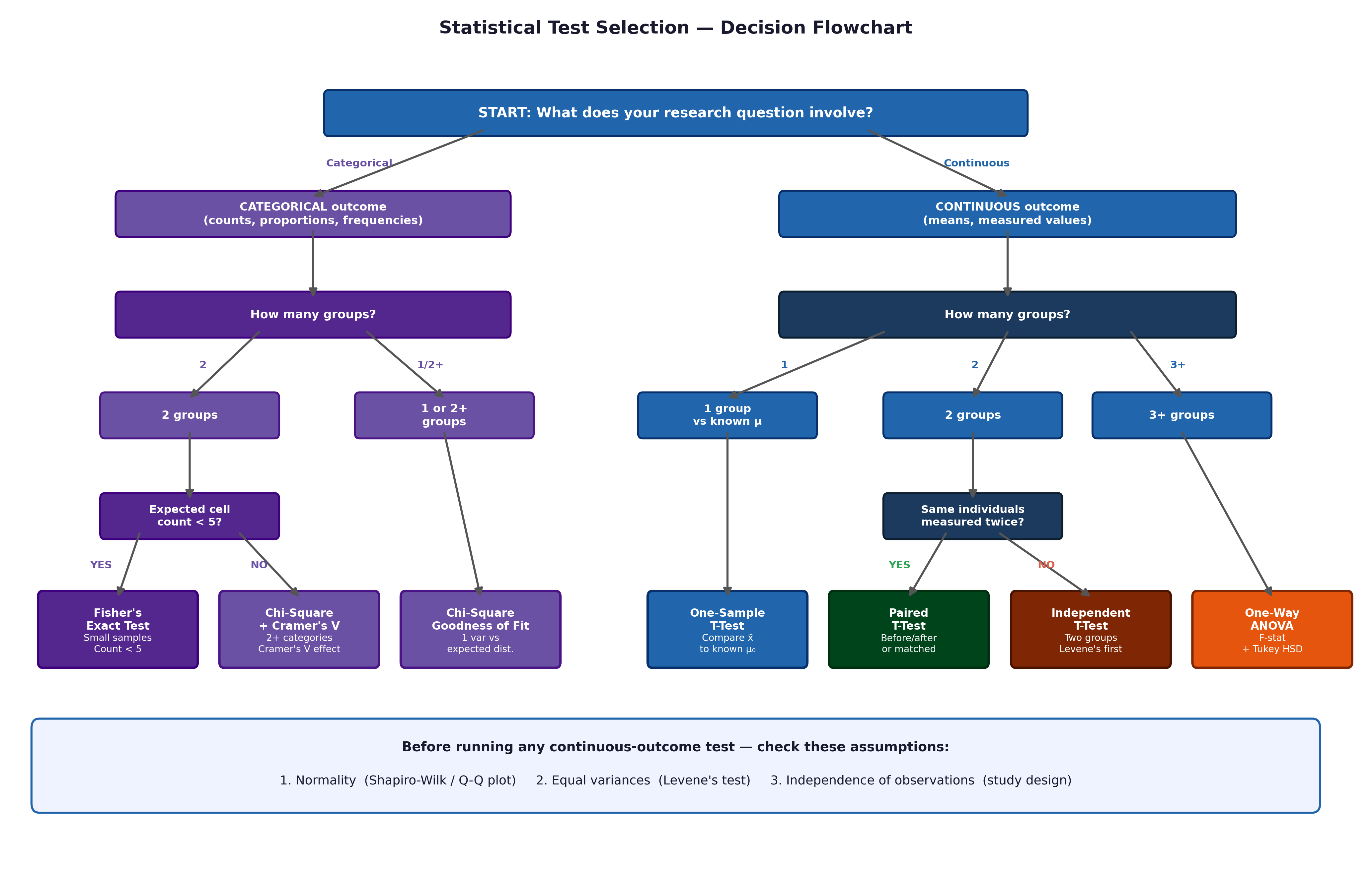 ⚡ Common mistake: Many students automatically reach for non-parametric tests whenever data “looks skewed.” Remember the Central Limit Theorem — with n ≥ 30 per group, parametric tests are robust to moderate non-Normality. Non-parametric tests have lower statistical power than their parametric equivalents, so switching unnecessarily increases the risk of a Type II error.